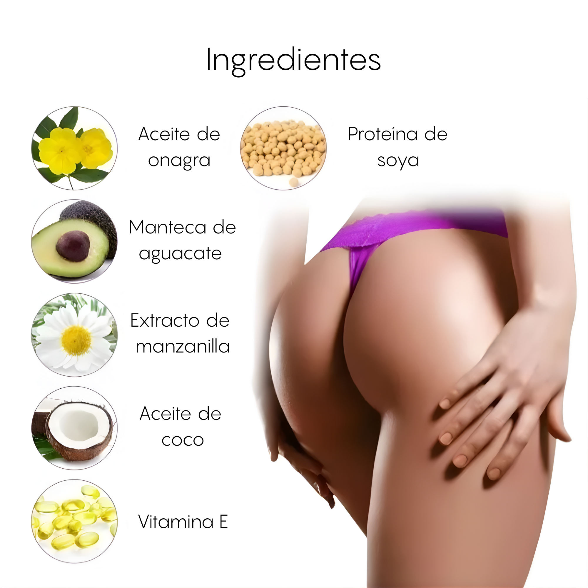 Propiedades Reafirmantes: Ayuda a mejorar la firmeza y apariencia de los glúteos, haciendo que luzcan más tonificados y voluminosos.